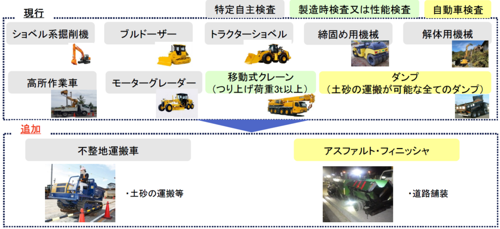※不整地運搬車は特定自主点検検査証が、アスファルト・フィニッシャは自動車検査証が必要